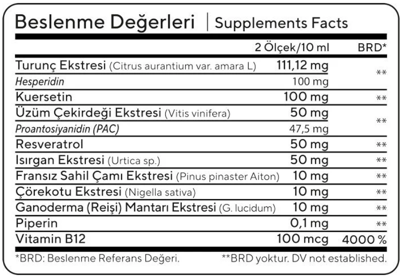 İçindekiler: Çözücü Deiyonize Su, Kıvam Arttırıcı Gliserin, Turunç (Citrus aur. var. a. L) Ekstresi (Hesperidin), Kuersetin, N V A G Food Supplement Containing Quercetin, Resveratrol, Hesperidin and Plant Extracts M Üzüm Çekirdeği (Vitis v.) Ekstresi (Proantosiyanidin(PAC)), Resveratrol, Isırgan (Urtica sp.) Ekstresi, Kıvam Arttırıcı Ksantam Gum, Koruyucu Potasyum Sorbat, Koruyucu Sodyum Benzoat, Fransız Sahil Çamı (Pinus pinaster Aiton) Ekstresi (%50 Proantosiyanidin), Çörekotu (Nigella sativa) Ekstresi, Ganoderma (Reişi) Mantarı (Ganoderma lucidum) Ekstresi, Piperin, Metilkobalamin (Vitamin B12).