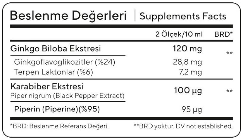 120 mg standardize Ginkgo Biloba ekstresi, özel formülasyonla hazırlanmış olup, Piperin desteğiyle biyoyararlanımı ve etkinliği artırılmıştır.