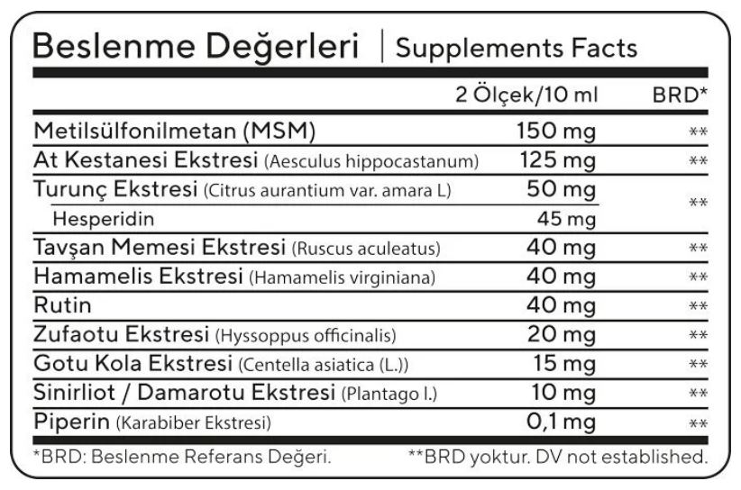 İçindekiler: Çözücü Deiyonize Su, Kıvam Arttırıcı Gliserin, Metilsülfonilmetan (MSM), At Kestanesi (Aesculus hippocastanum) Ekstresi, Turunç (Citrus aurantium var. amara L) Ekstresi (Hesperidin), Tavşan Memesi (Ruscus aculeatus) Ekstresi, Hamamelis (Hamamelis virginiana) Ekstresi, Rutin, Kıvam Arttırıcı Ksantam Gum, Zufaotu (Hyssoppus officinalis) Ekstresi, Gotu kola (Centella asiatica (L.)) Ekstresi, Sinirliot / Damarotu (Plantago lanceolata) Ekstresi, Koruyucu Potasyum Sorbat, Koruyucu Sodyum Benzoat, Piperin.