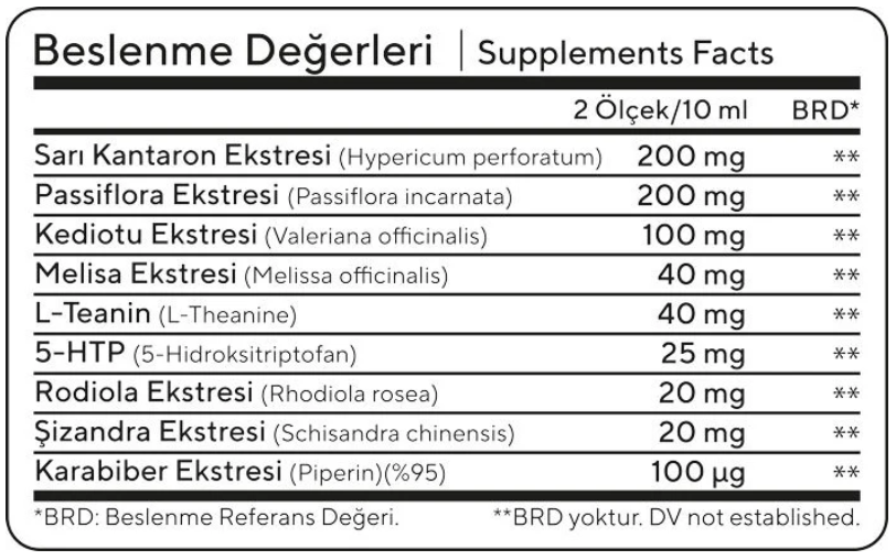 İçindekiler: Çözücü Deiyonize Su, Kıvam Arttırıcı Gliserin, Sarı Kantaron Ekstresi (Hypericum perforatum), Passiflora Ekstresi (Passiflora incarnata), M Valerian/Kediotu Ekstresi (Valeriana officinalis), Melisa Ekstresi (Melissa offi.), L-Teanin, 5-Hidroksitriptofan (5-HTP), Rodiola Ekstresi, Şizandra Ekstresi (Schisandra ch.), Kıvam Arttırıcı Ksantam Gum, Koruyucu Potasyum Sorbat, Koruyucu Sodyum Benzoat, Piperin.