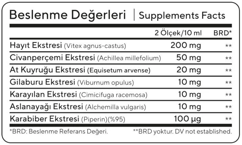 İçindekiler: Çözücü Deiyonize Su, Kıvam Arttırıcı Gliserin, Hayıt (Vitex agnus c.) Ekstresi, Civanperçemi (Achillea m.) Ekstresi, At Kuyruğu (Equisetum ar.) Ekstresi, Kıvam Arttırıcı Ksantam Gam, Gilaburu (Viburnum op.) Ekstresi, Karayılan (Cimicifuga r.) Ekstresi, Aslanayağı (Alchemilla vulgaris) Ekstresi, Koruyucu Potasyum Sorbat, Koruyucu Sodyum Benzoat, Karabiber (Piper nigrum) Ekstresi (Piperin).