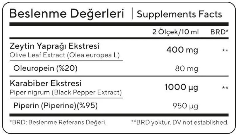 Özel teknolojilerle biyoyararlanımı artırılmış 400 mg Zeytin yaprağı ekstresi ve %20 Oleuropein içeriği, %95 Piperin ekstraktıyla güçlendirilmiş bilimsel formülasyon.